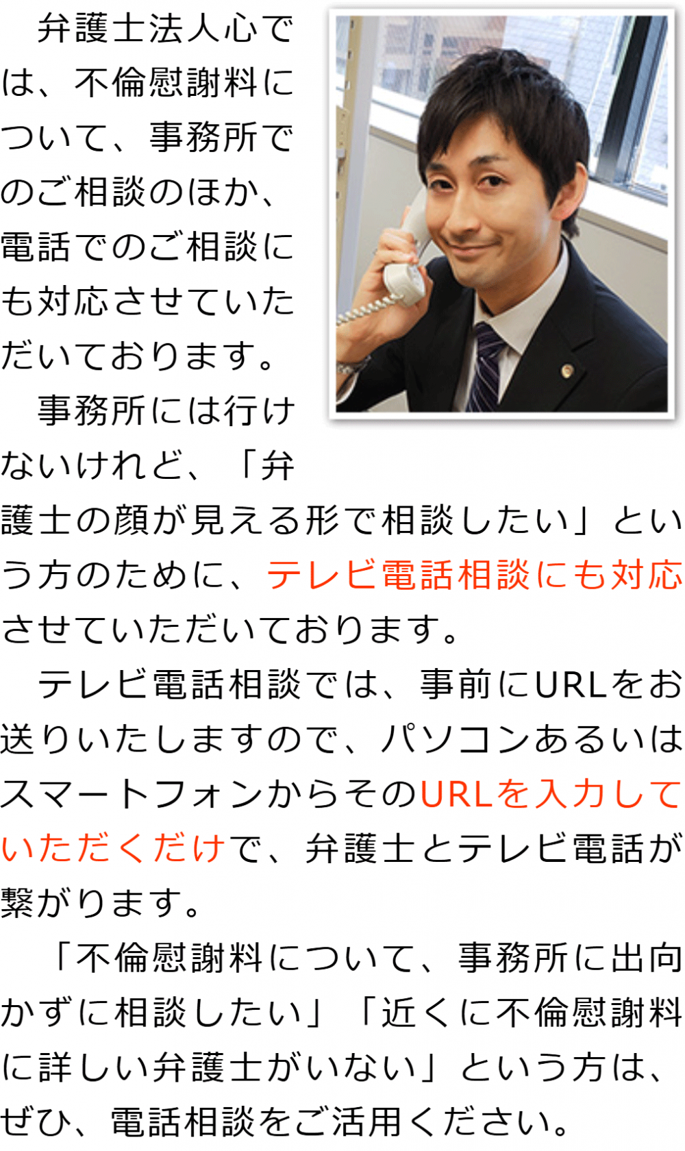 トップその他電話相談・テレビ電話相談について 階層構造▼ その他(目次) 電話相談・テレビ電話相談について その他(目次)その他トップ共通バナー元※削除不可心グループニュース(新着情報)弁護士・スタッフ選ばれる理由お役立ち情報・Q&Aお役立ち情報不倫の慰謝料請求の時効不倫慰謝料の支払いができない相手への対応不倫の誓約書(示談書・合意書)の内容について浮気相手にだけ不倫慰謝料を請求したい! 不倫慰謝料の相場はいくらか不倫慰謝料で失敗するケース不倫慰謝料請求の手続きの流れQ&A不倫慰謝料の求償権に関するQ&A電話相談・テレビ電話相談について代表メッセージ地域情報プライバシーポリシー 受付時間 平日 9時~21時、土日祝 9時~18時 夜間・土日祝の相談も対応します (要予約) 所在地 〒272-0023 千葉県市川市南八幡4-8-9ニューグリーンビル5F 0120-41-2403 お問合せ・アクセス・地図